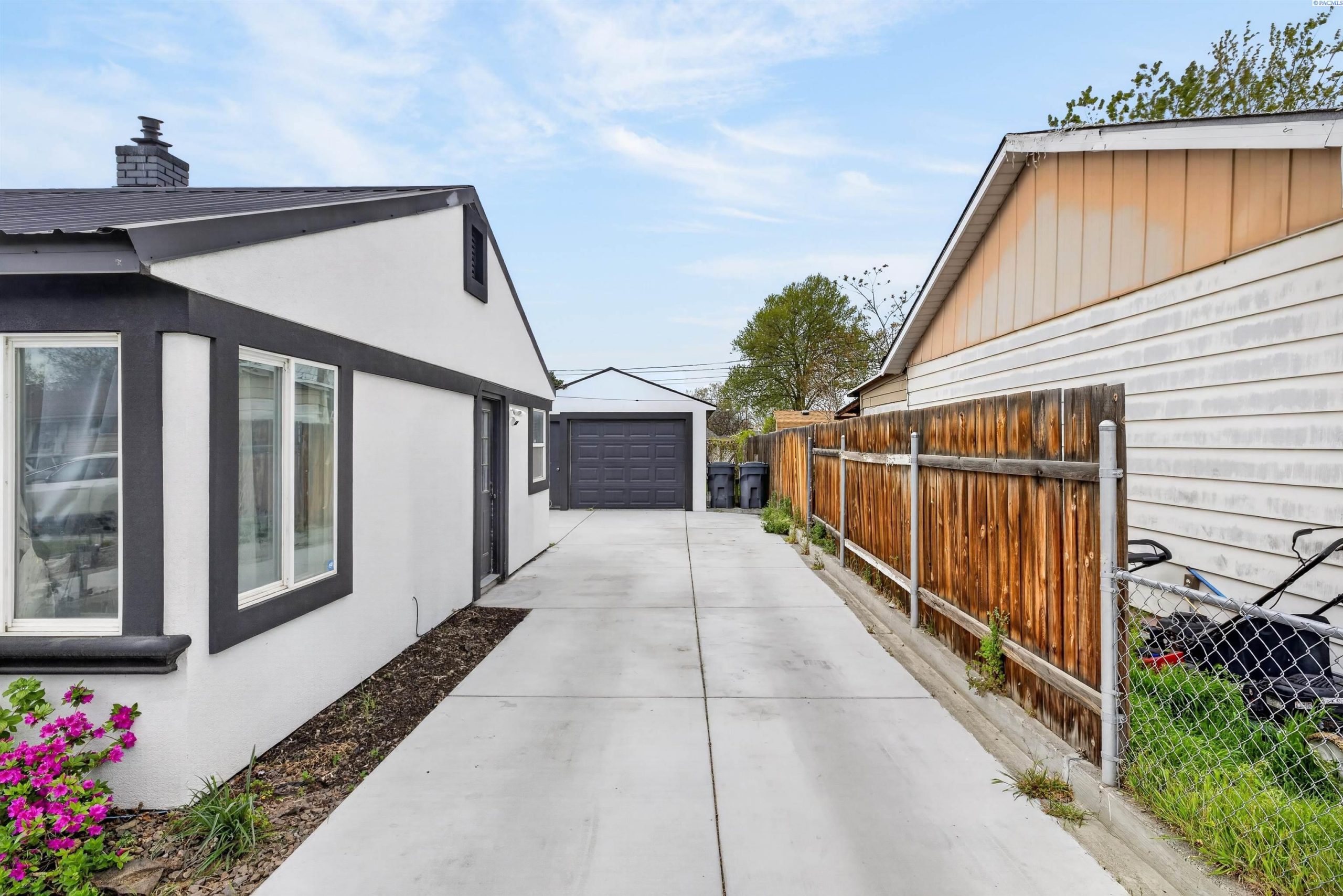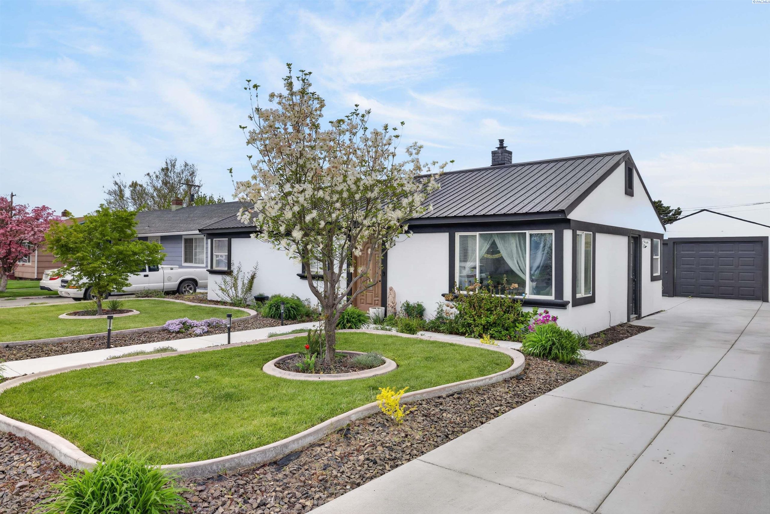 MLS# 292166 Charming single-level home in the heart of Central Pasco! This well-maintained home offers great curb appeal with nicely landscaped grounds, concrete curbing, and a long driveway providing ample parking leading to a detached garage. The exterior features a low-maintenance stucco finish and a durable metal roof built for longevity. Inside, you’ll find a bright, neutral interior with unique architectural touches such as decorative wall arches that add character and style. The updated kitchen includes granite countertops, an elegant backsplash, and a functional layout perfect for everyday living. The updated bathroom features a tiled shower with a wall-mounted rainfall head and quartz countertops. Step outside to enjoy the covered patio with a gazebo-style roof that’s ideal for outdoor entertaining or relaxing. The fully fenced backyard is complemented by timed underground sprinklers on city water for easy upkeep. Conveniently located near schools, parks, and with quick access to the highway, making commuting and daily errands a breeze.